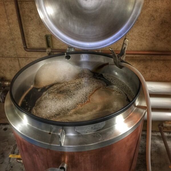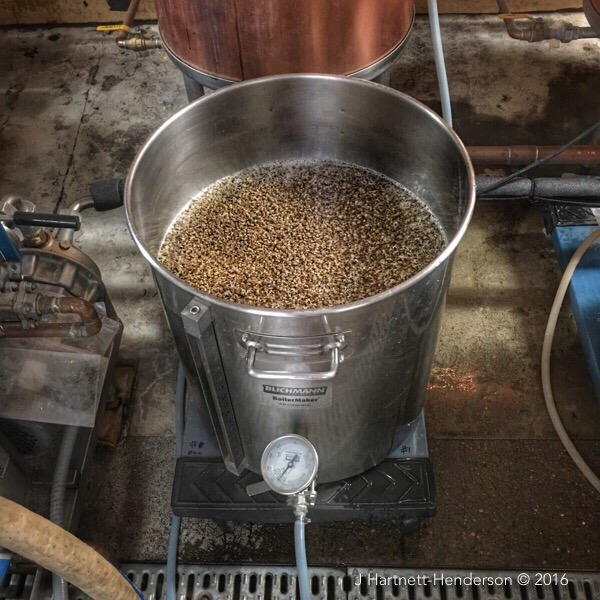 When the water flows through the grain it’s pulled out of the bottom of the mash tun and pumped into a boil tank. That’s where I boiled the wort and added the hops.