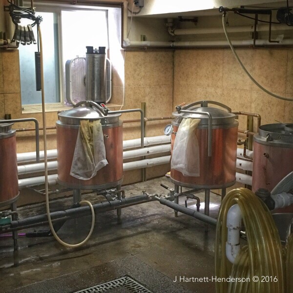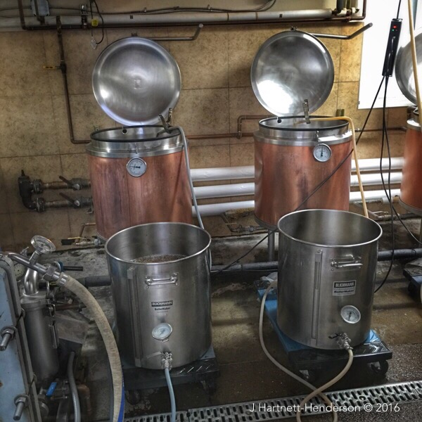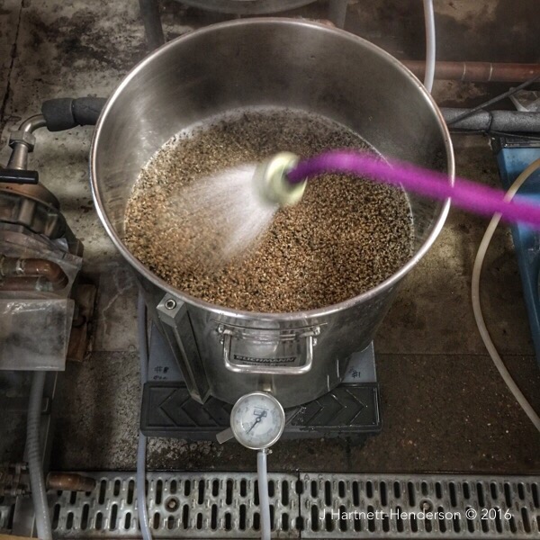 After mash in (adding the grains to the water) I opened the valve at the bottom of the mash tun and began pumping the water out through the hose on the right to the boil tank. This separated the mash from the grains. Moving the liquid to another vessel is called lautering.