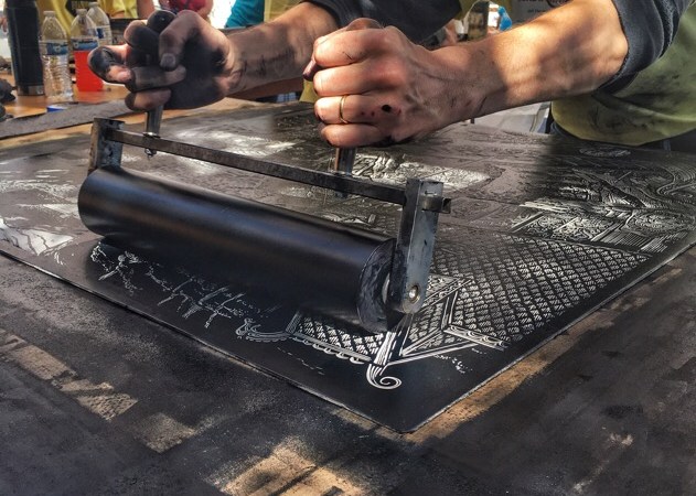 The 14th Annual Roadworks Steamroller Printing Festival happened on Sunday at the San Francisco Center for the Book. It was a blast and the weather was perfectly sunny yet not too warm. A swarm of people watched a beehive of volunteers make prints.