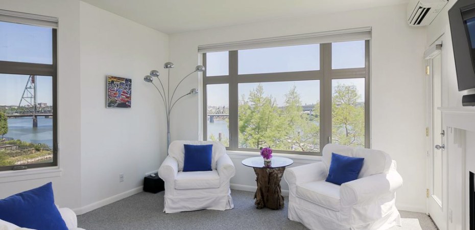 The real star of the show in this client’s setting is the million dollar view. Bright blue pillows ground the interior with color pulses. The image on the wall has strong primary colors of red, yellow and blue and includes the same blue of the pillows. The dragon boat image is a local reference. Dragon boats practice year round and race twice a year just outside the window.