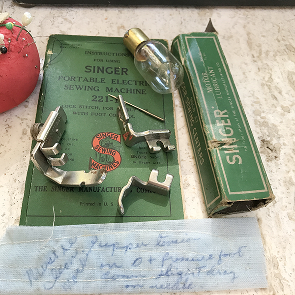 At my husband’s encouragement, I pulled my mother-in-law’s portable Singer sewing machine out of storage in September. Some feature research helped me peg it as a 1951 Featherweight.