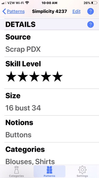 And each pattern has detail fields that include source, skill level, size, notions, category of clothing and fabric.