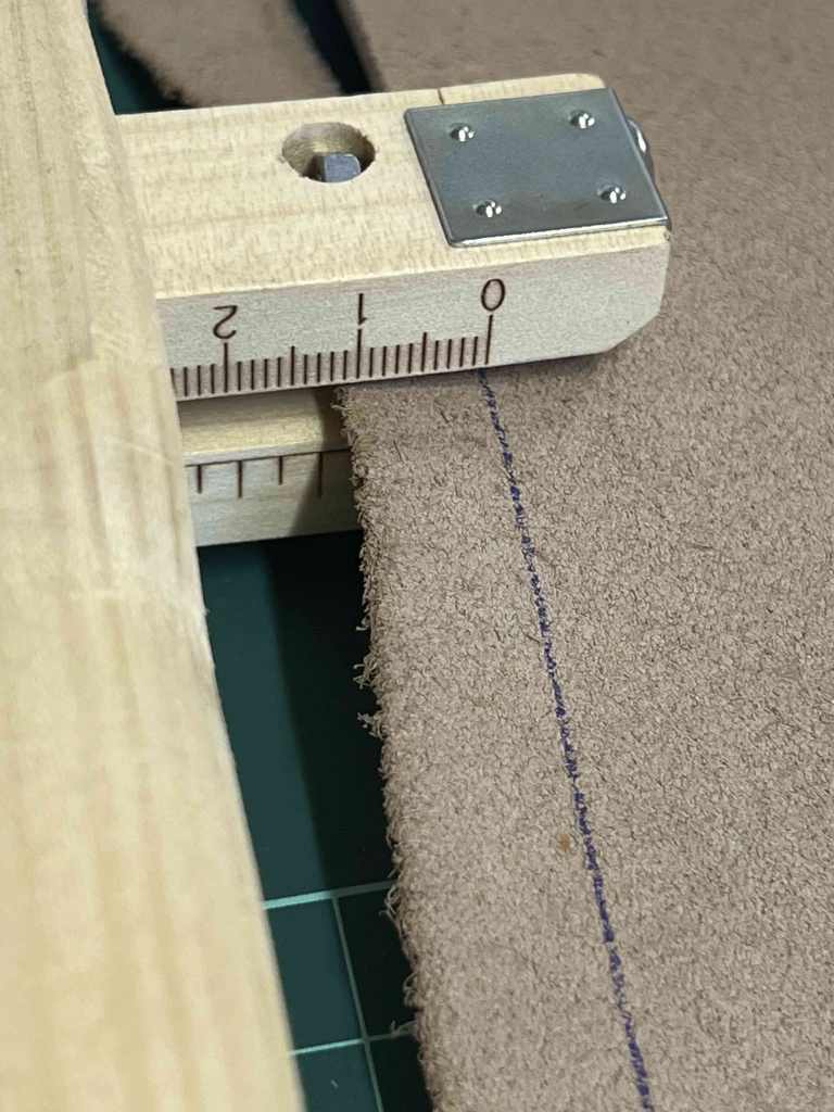 - To true up the edge first draw a straight line along the (spine) length. Set the width of your strap cutter wider than the widest part you’ll need to cut off. Align the zero on the strap cutter (where the blade is) with your line. Pull and keep the zero on the line as you go down the length.