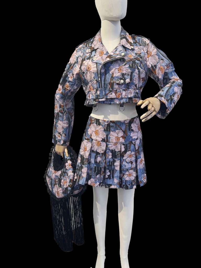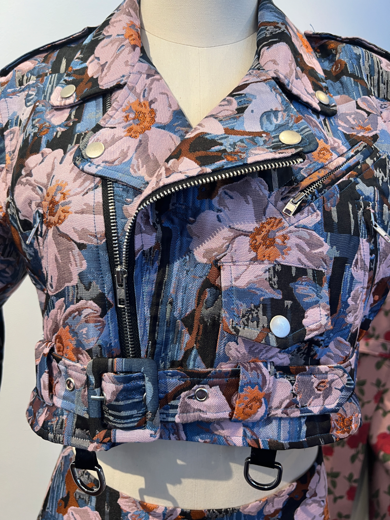 Yun Qu, who designs for the brand Videmus Omni, combined fabric deadstock with inspiration from Debussy, Hokusai, and Renoir to create the Claire De Lune collection. In one of the pieces (pictured below) the designer takes a heavy motorcycle jacket silhouette and turns it into something light and full of motion. The workmanship is a delight. The seams are so beautiful!