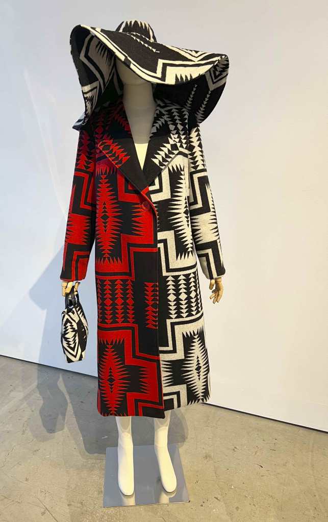 Korina Emmerich (Puyallup Tribe) explores the different meanings and history behind the blankets and surface patterns most often associated with the Pendleton brand. The all-encompassing ensemble includes a hat, purse, and coat. The coat and the purse are pattern matched. Emmerich’s work has been exhibited at The Metropolitan Museum of Art.