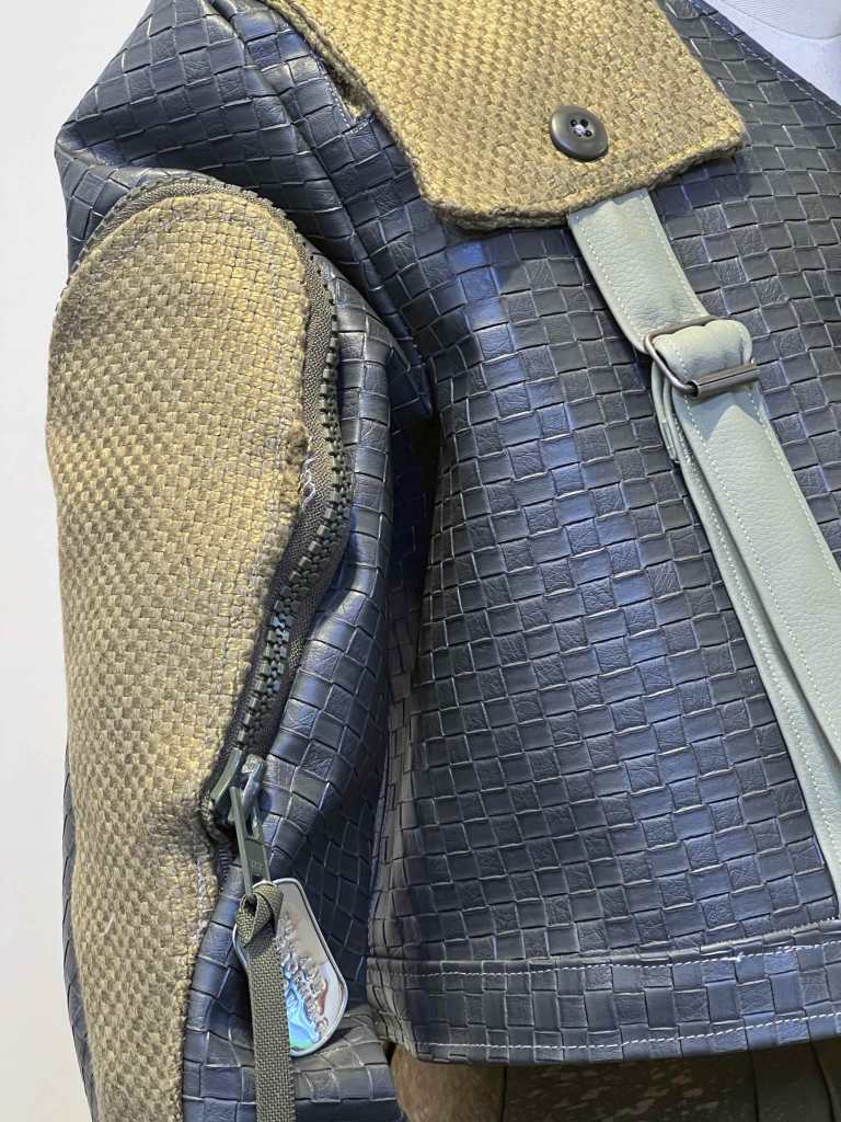 Diorio uses renewable resources to make the collection. I love the mix of textures of the burlap, vegan leather, dog tag, heavy zipper, and woven material. The roundness of the buttons repeat at the sleeve and shoulder burlap rectangles give a route for the eye to travel up and down. The quality of workmanship is also quite lovely especially considering how difficult some of the materials are to work with.