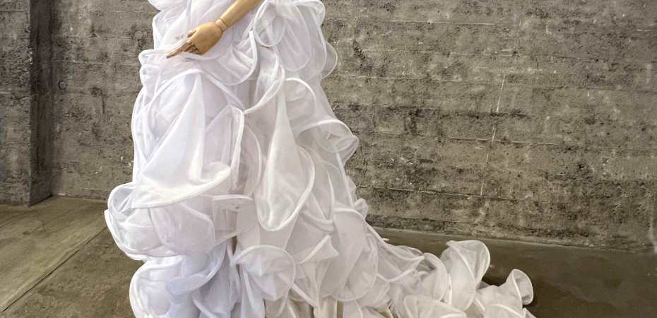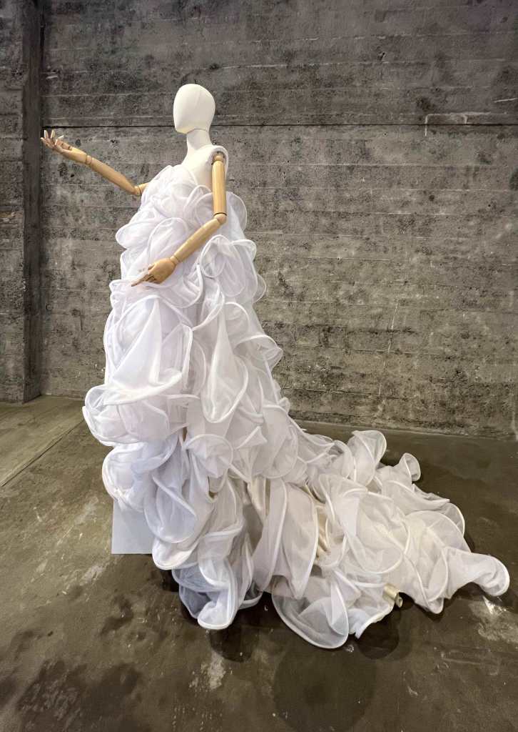 Kyle Denman’s “mul·ti·po·lar—ex·ist·ence” collection uses rigilene to achieve the rolling wave forms in his pieces. The Project Runway winner uses another method that I first saw in the Guo Pei exhibit in San Francisco. He layers fabric vertically with a shape in profile. Here’s a closeup of the sleeve from the black dress above.
