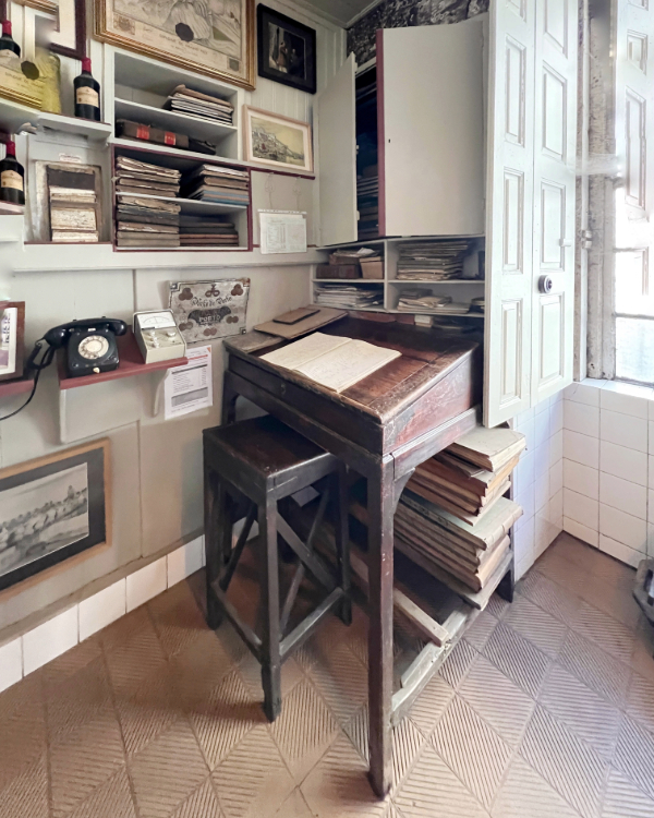 We followed a broad pathway through the vast black room of barrels to a tiny room filled with Vermeer-slanted window light. The room was a small lab which they call “casinha”. Note the landline and all of the ledgers from history.