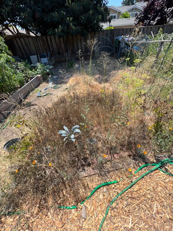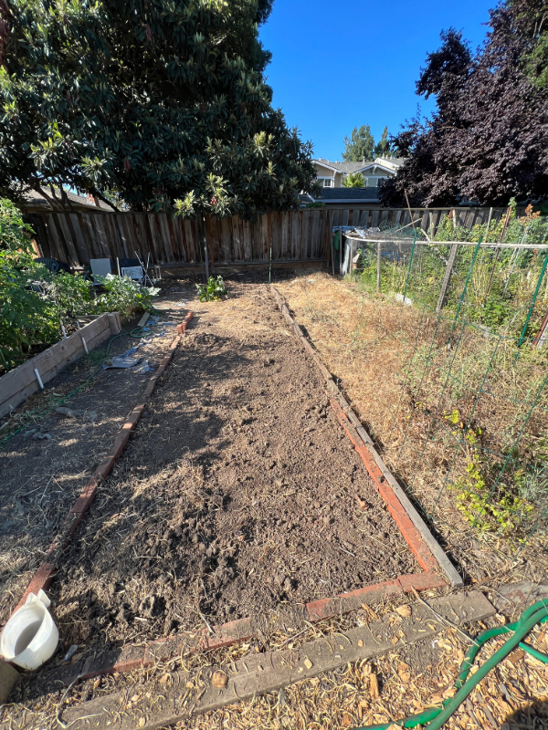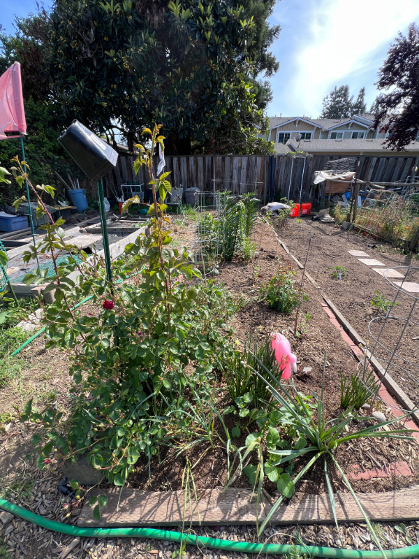 When I first got the plot, it was in bad shape. Almost everything was dead brown or diseased. Near the front of the plot on the left, was a scraggly rose bush. It had yellow leaves, black spot fungi, and rust fungi all at once. I pulled out everything including the rose. Now my plot looked barren.