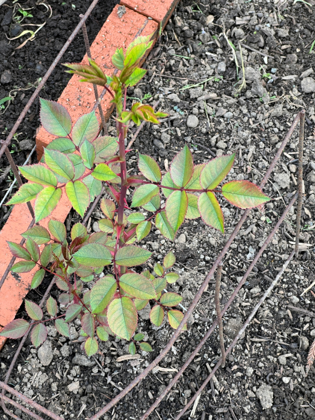 I planted a few things in my cleared plot but I did not plant any roses. Even so, in the Spring of 2024, the rose I had removed sprouted! I tenderly put a support around it to mark this special happening.